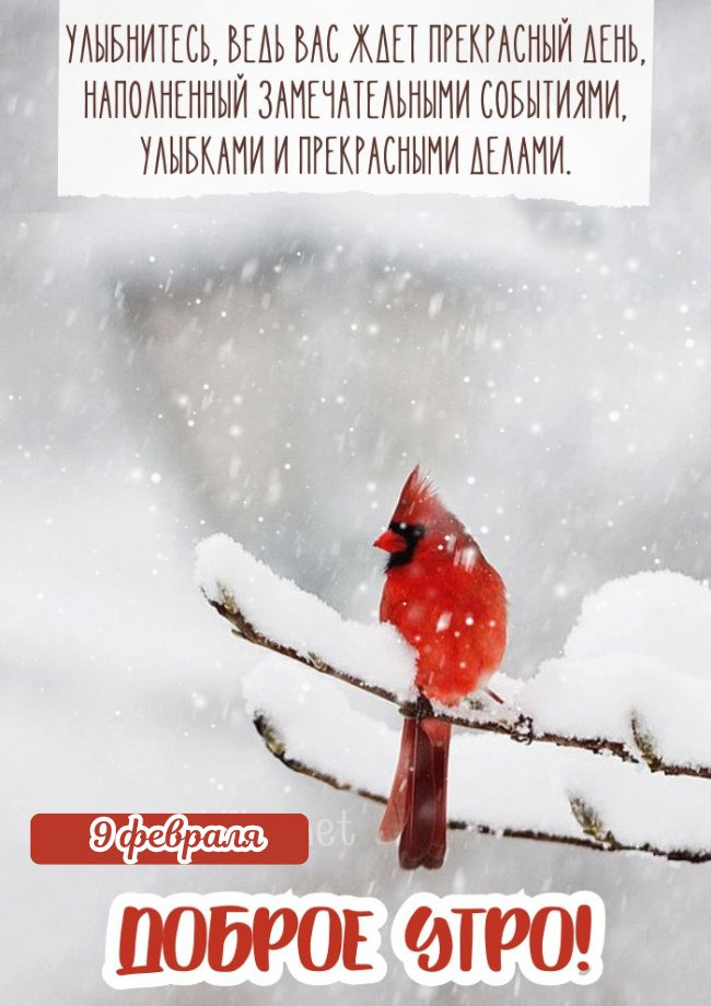 Неповторимая подборка — картинки и открытки доброе утро 9 февраля! Природа отдыхает, даря нам покой и возможность восстановиться. Пусть сегодняшний день станет началом чего-то хорошего, наполнится добрыми поступками и искренними словами.