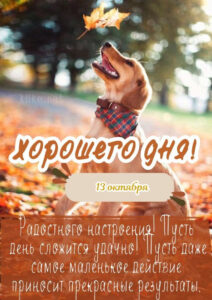 Многообещающая подборка — картинки и открытки на 13 октября: стоящие и положительные пожелания на утро, день, вечер и ночь. Погода становится прохладнее, и мир вокруг наполняется золотыми оттенками. Пусть этот период принесёт множество ярких событий и подарит тебе вдохновение для новых начинаний и свершений. Скачайте или отправьте бесплатно картинку. HTML-код для вставки на сайт и …