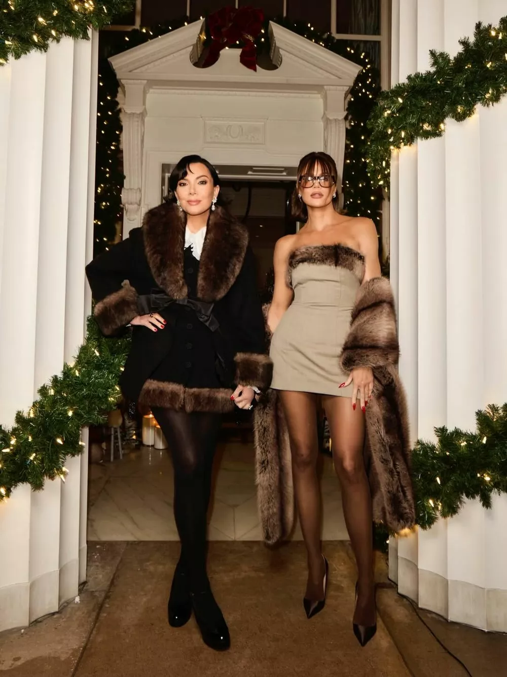 И Кардашьян, и Дженнер были одеты в праздничные наряды с меховыми акцентами. Кардашьян выбрала бежевое мини-платье без рукавов с меховой накидкой, а Дженнер — черное пальто с меховым воротником и манжетами.