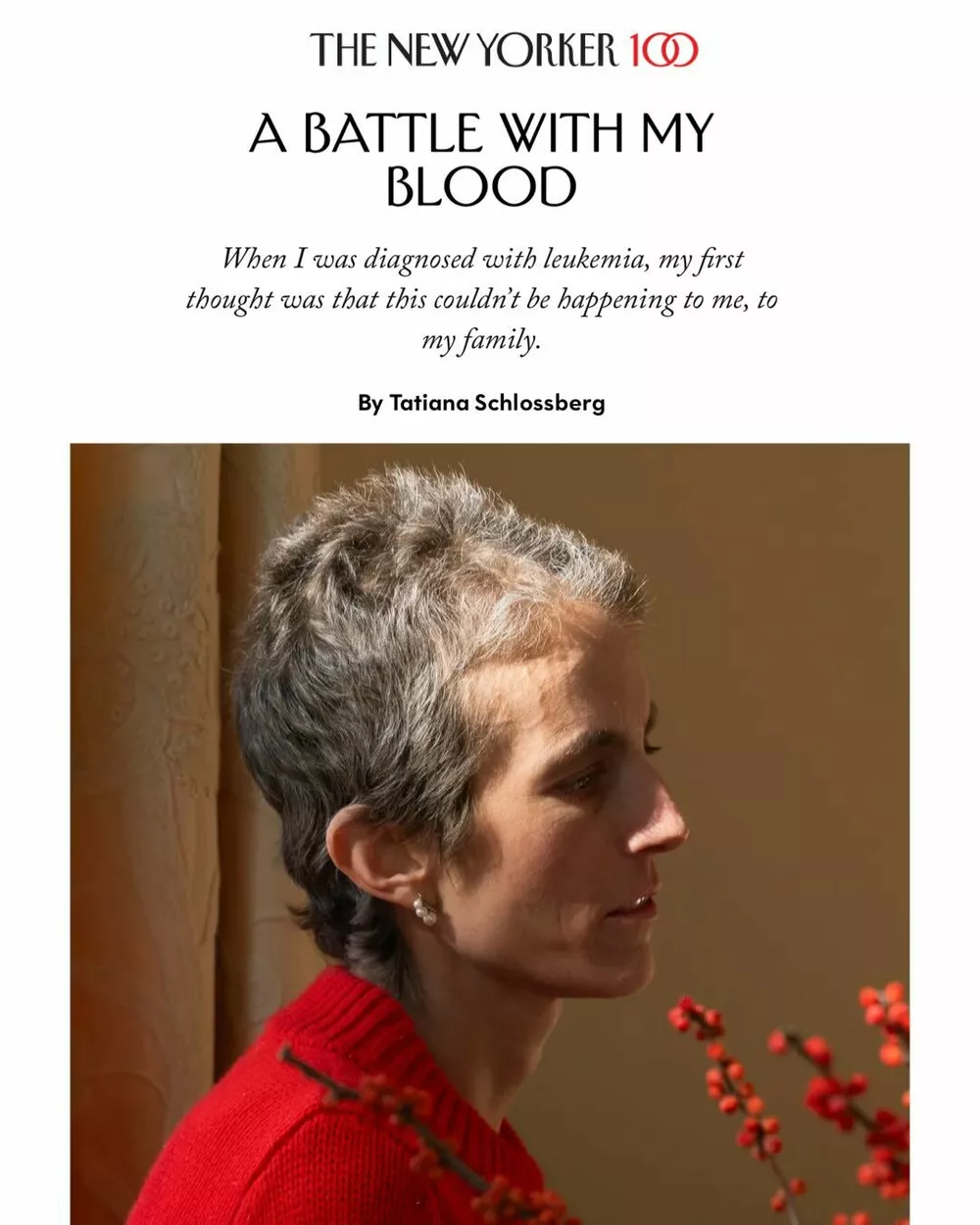 В статье Шлоссберг сообщила, что в мае 2024 года у нее диагностировали острый миелоидный лейкоз — разновидность рака крови. Дочь Кэролайн Кеннеди и Эдвина Шлоссберга рассказала, что врачи обнаружили болезнь только после рождения ею второго ребенка в ходе обычных анализов крови.