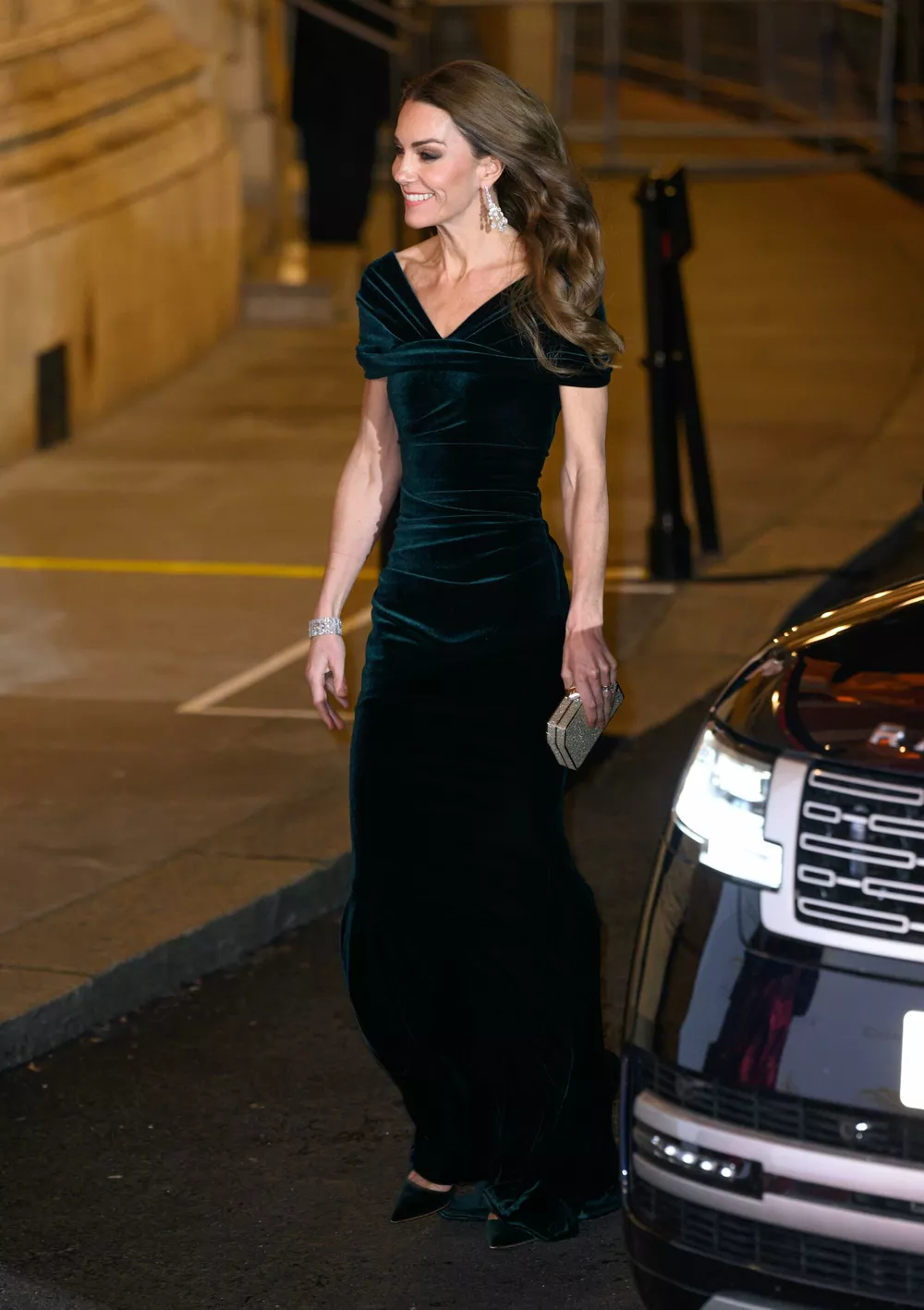 На большой концерт в лондонском зале Royal Albert Hall 43-летняя Кейт пришла в сопровождении мужа, принца Уильяма, и для редкого выхода в свет выбрала поистине элегантный наряд. Принцесса примерила изумрудное бархатное приталенное платье с драпировкой по всей длине и пикантным декольте, открывающим плечи, что со стороны Кейт можно считать легким нарушением королевского дресс-кода.