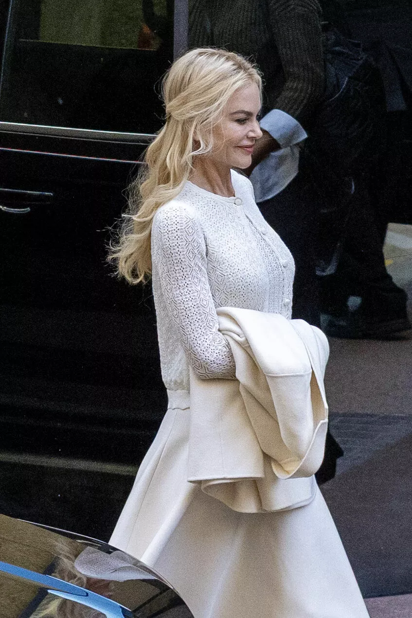 Кидман надела белый кружевной кардиган, застегнутый только на верхнюю пуговицу, трикотажный топ поверх блузки в тон, а также кремовую юбку-миди. Актриса завершила образ туфлями на шпильке телесно-розового цвета. Николь уложила длинные светлые локоны в элегантную прическу с локонами, обрамляющими лицо.