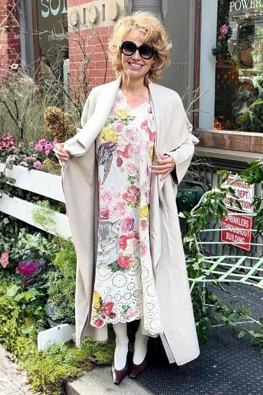На презентацию в Сохо Памела нарядилась в нежное белое платье с разноцветным цветочным принтом и кружевными вставками, а сочетала его с белоснежными колготками в рубчик, коричневыми лодочками с квадратным мысом и длинным бежевым тренчем нестандартного кроя. Образ Андерсон дополняли массивные солнцезащитные очки и пышные кудри.