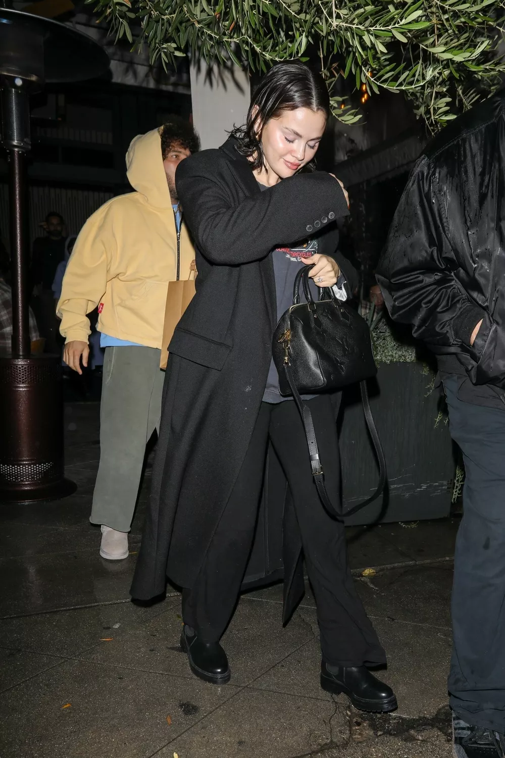 Звездная пара устроила себе непринужденное свидание тет-а-тет в ресторане Saffy’s в Лос-Анджелесе. На место муж и жена прибыли вымокшими под осенним ливнем до нитки и были одеты повседневно: певица носила черные брюки клеш в сочетании с серым свитшотом и длинным черным пальто, а также ботинками челси на массивной подошве и кожаной сумкой-тоутом от Louis Vuitton, в то время как продюсер вышел на свидание в солнечно-желтой зип-худи, голубой футболке, оливковых брюках и бежевых замшевых ботинках.