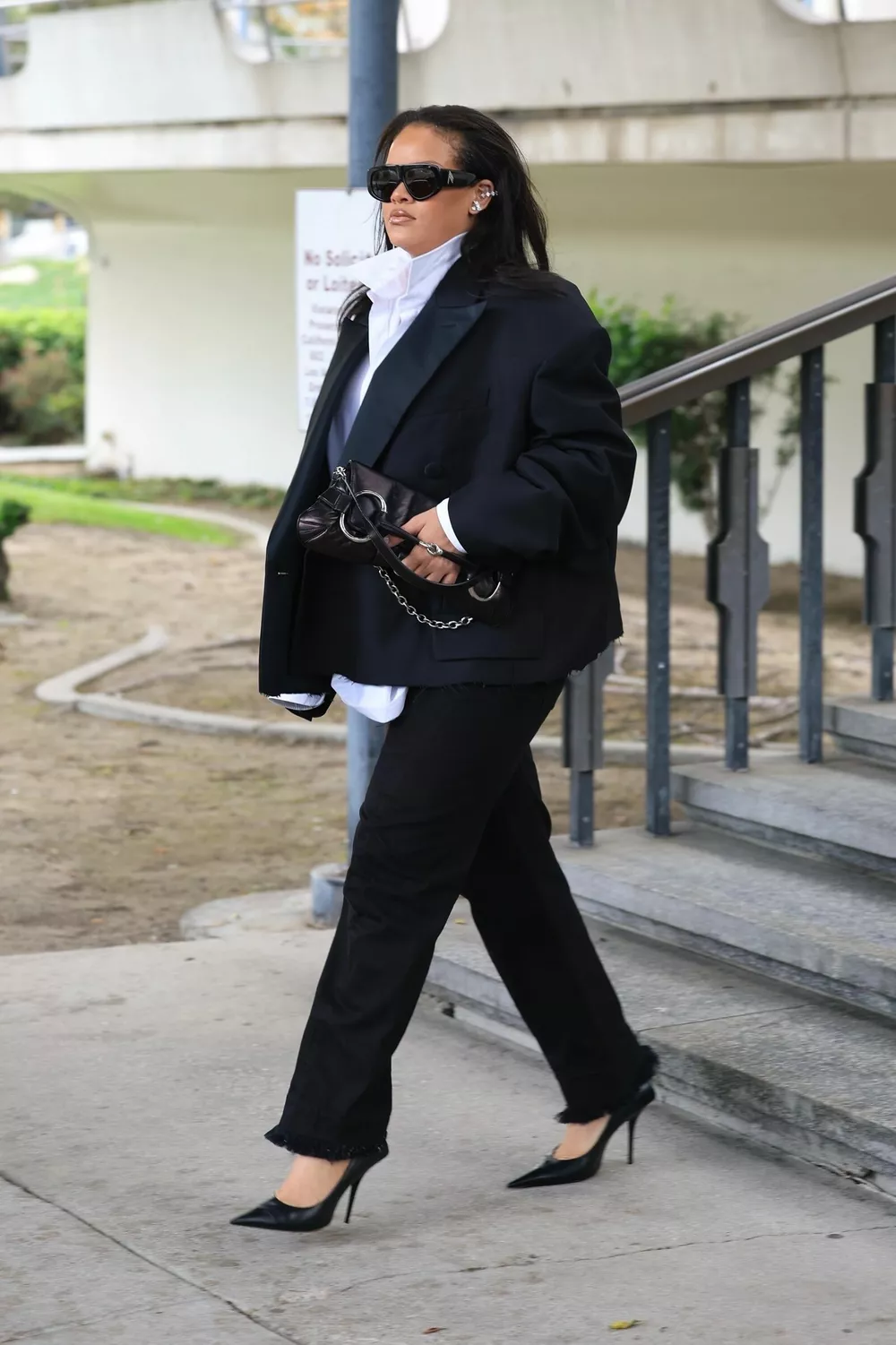 По делам семейным в госучреждение Рианна отправилась в соответствующем офисном маскулинном аутфите. Артистка надела свободный укороченный черный пиджак, прямые черные джинсы с необработанным краем, а также белоснежную рубашку с поднятым воротником, черные лодочки на высоком каблуке, кожаный клатч необычного дизайна, солнцезащитные очки и лаконичные украшения с бриллиантами.