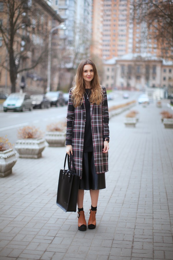 Просто великолепное сочетание – пальто-рубашка и клетка. Можно взять стильную рубашку в клетку, на низ надеть черные обтягивающие джинсы, сверху – теплое пальто-рубашка. Стильный уличный лук готов!