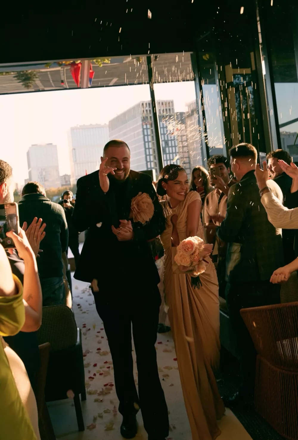 Гайворонский отдал предпочтение классическому черному костюму. Молодые супруги прошли сквозь приветствующую толпу под аплодисменты гостей. На другом снимке запечатлена улыбающаяся Севиль, с любовью смотрящая на своего мужа.