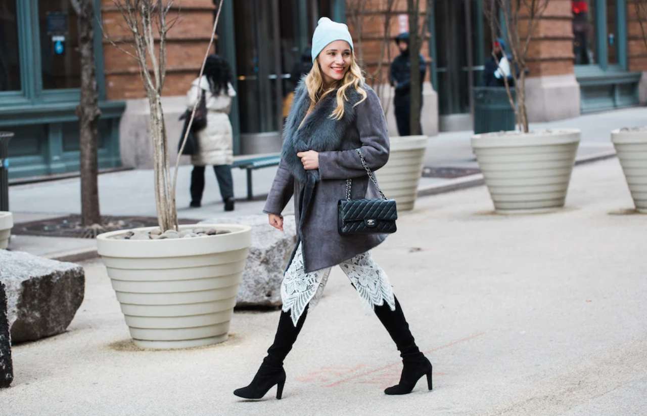 Один из самых выигрышных приемов — сочетать нежное кружево с тяжелой зимней обувью. Грубые ботинки, сапоги на массивной подошве или казаки делают образ современным и устойчивым. Этот контраст сразу убирает ощущение «бельевого» наряда и переводит образ в плоскость городского стиля. Чем спокойнее крой платья, тем смелее может быть обувь.